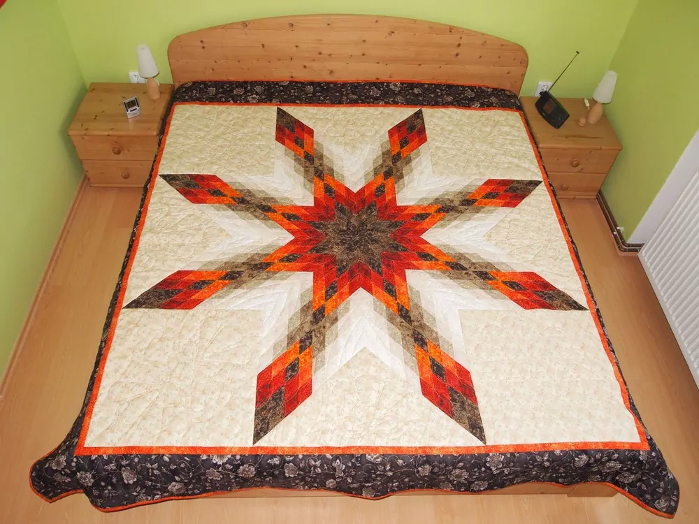 Patchworkový přehoz se vzorem hvězdy o rozměru 225 x 225 cm určený na dvojlůžko v krásných zářivých barvách podzimu. Hodí se především do přírodně zařízených ložnic. Zútulní vaši ložnici a přispěje k jedinečnosti vašeho domova. Je velmi příjemný na dotek, měkkoučký a mírně hřejivý.