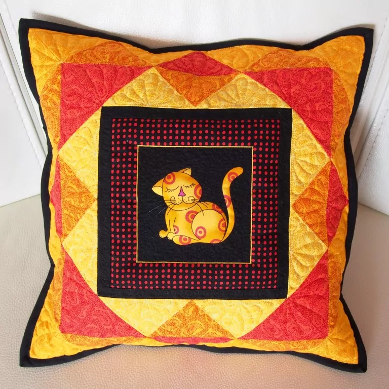 Originální patchworkový polštář hustě prošitý náročným quiltováním ve veselých jarních barvách s motivy kočiček.