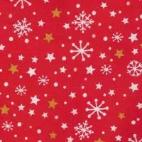 100% bavlněná látka se sněhovými vločkami v bílé barvě a zlatotiskem hvězdiček na červeném podkladu vhodná pro vaše vánoční a zimní projekty.