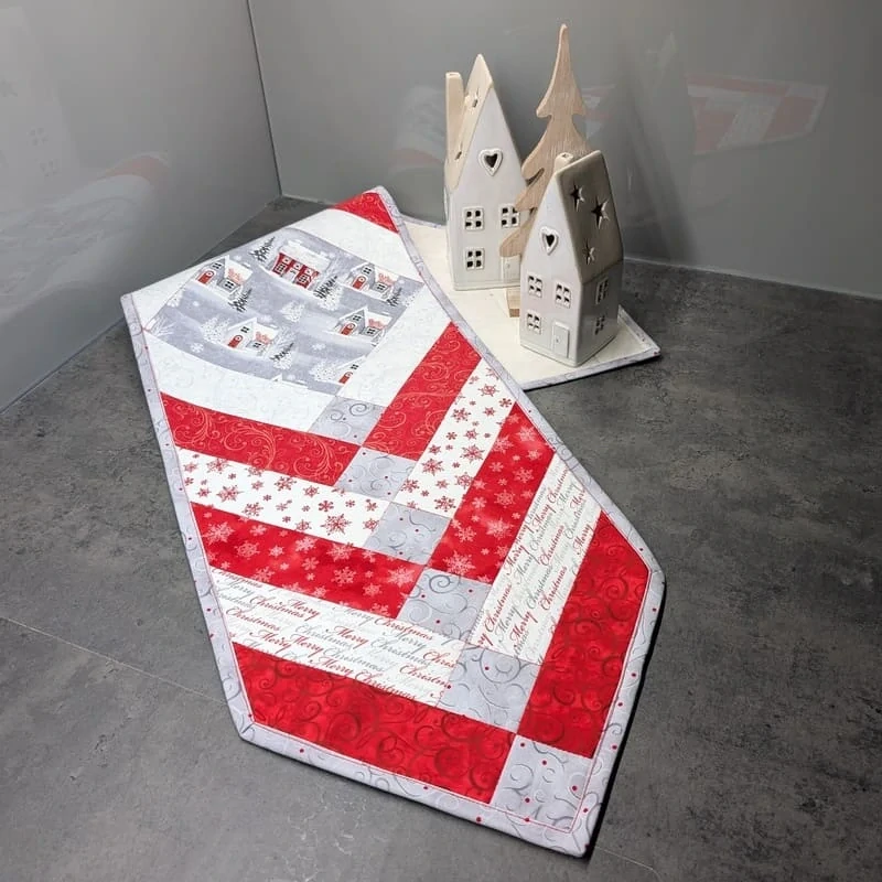 Patchworkový vánoční běhoun či ubrus v kombinaci červené, bílé a šedé o rozměru 30 x 115 cm. Běhoun rozveselí váš vánočně prostřený stůl, dodá šmrnc vaší komodě nebo okennímu parapetu.