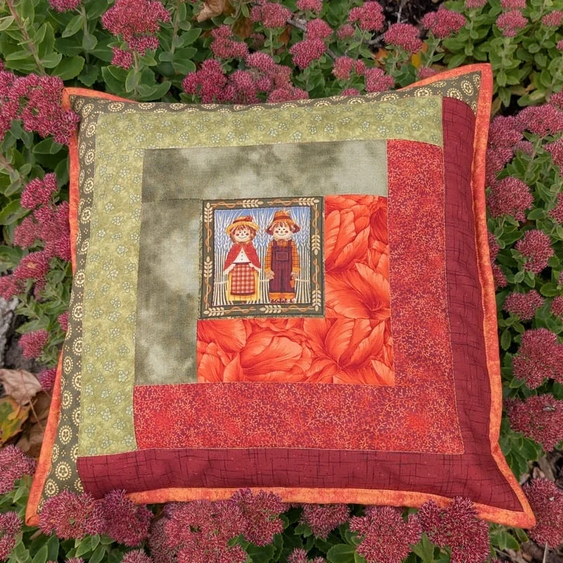 Podzimní patchworkový polštář se vzorem Srub se bude vyjímat v každém interiéru.