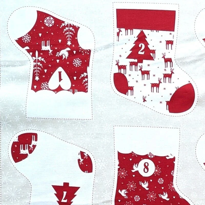 100% bavlněný panel látky s předtištěnými punčoškami pro adventní kalendář s čísly 1 - 24 v červeno bílé kombinaci s norskými vzory.