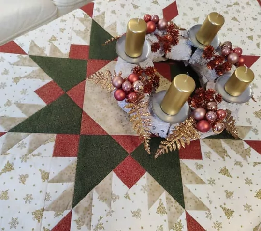 Tento ubrus je ušitý patchworkovou technikou Peříčková hvězda. Je to velmi náročný vzor na výrobu, jelikož se skládá z mnoha různých tvarů, které na sebe navazují špičkami a pokud by nebyl přesně a pečlivě ušitý, nebude vypadat pěkně. Nejprve si připravím návrh ubrusu a vyberu vhodnou kombinaci látek, které k sobě ladí a mají vánoční vzor. Látky vyperu a vyžehlím, pak podle postupu pro šití této techniky ušiju dekorační stranu ubrusu, pod kterou přižehlím sakon a podložím spodní látkou. Tyto tři vrstvy prošiji = proquiltuji. Nakonec běhoun olemuji. Během celého šití je velmi důležité pečlivé rozžehlování každého švu, aby na sebe sedělo vše, jak má.