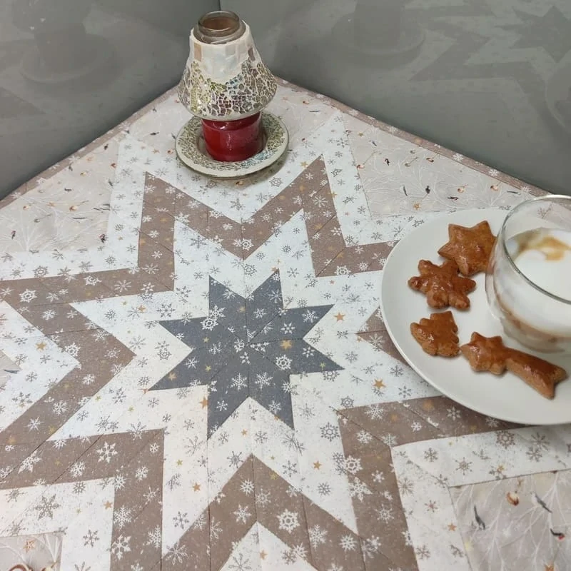 Ubrus je ušitý z bavlněných dovozových látek se zimními motivy, spodní strana ubrusu je z přírodní jednobarevné látky a vnitřní vrstvu tvoří sakon. lterý ubrus zpevní, ale přitom může splývat volně přes hranu stolu. Všechny tči vrstvy jsou prošité ve tvaru hvězd melírovanou matalickou nití, která dává celému ubrusu nádech luxusu.