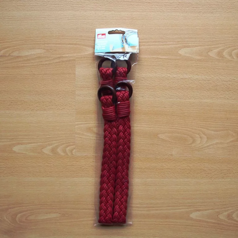 materiál: červený provázek - z 8 pramenů upletený plochý cop zakončený dřevěným kolečkem v hnědé barvě